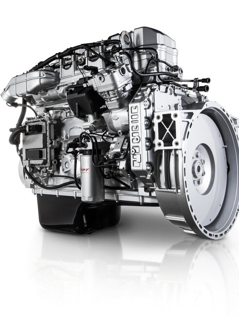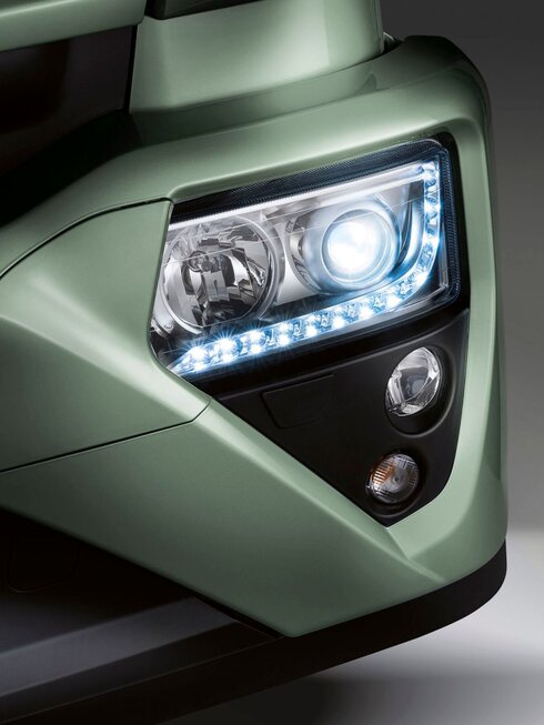 Im Stoßfänger sind die Trittstufen für den Aufstieg zur Kabine und der Radarsensor des fortschrittlichen Fahrerassistenzsystems und des Notbremsassistenten AEBS (Advanced Emergency Braking System) integriert. Die Scheinwerfer sind serienmäßig mit LED-Tagfahrlicht (DRL) ausgestattet.